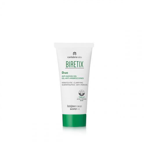 Biretix Duo Gel exfoliante y purificante para pieles con tendencia acneica. Sus ingredientes estimulan la renovación celular y realizan una suave exfoliación superficial que ayuda a prevenir las imperfecciones. Contiene Retinsphere® Technology, una innovadora combinación de retinoides que contribuye a prevenir la obstrucción de los poros, y BIOPEP 15 que reduce la proliferación de microorganismos.